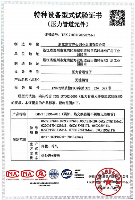 浙江東方齊心以不銹鋼系列產(chǎn)品為主導(dǎo),品種有不銹鋼管、奧氏體不銹鋼管、高溫合金鋼管、雙相不銹鋼管、鎳基合金管、冷凝器用管、U形管、核電管、不銹鋼管件、法蘭、閥門等。規(guī)格有6-2020x0.8-60mm,Ф16-25長度可達(dá)33m。公司擁有精密制造鋼管的各類機(jī)械設(shè)備25臺(套),其中各類冷軋管機(jī)15臺, 冷拔機(jī)10臺,天然氣熱處理爐2套。